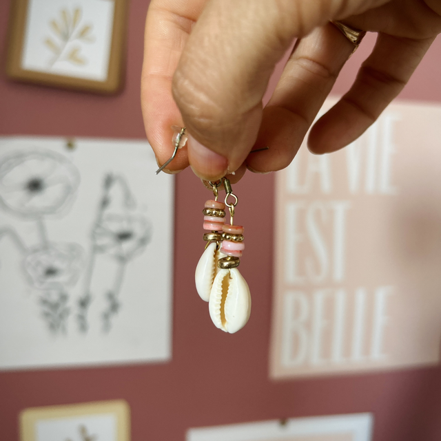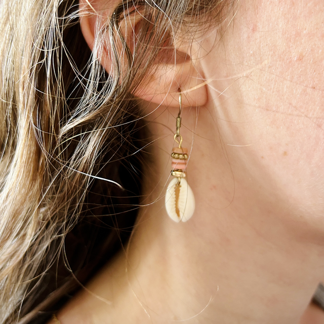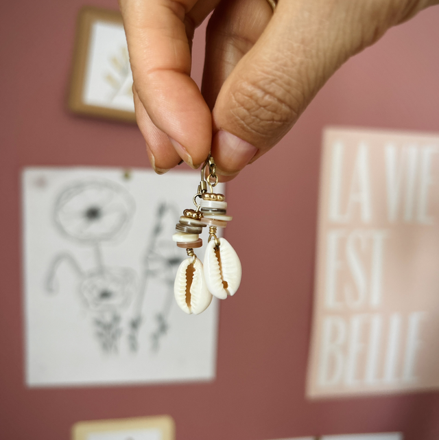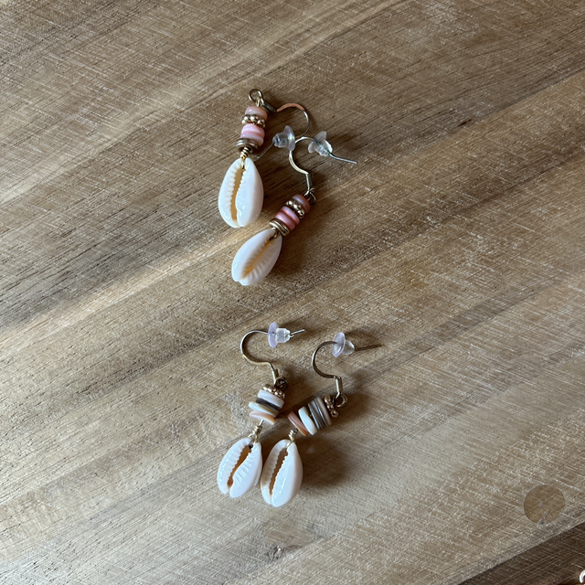 Ce modèle est monté sur des perles de coquillages plates ainsi qu’un coquillage CAURI le tout sur un fermoir en acier inoxydable ✨